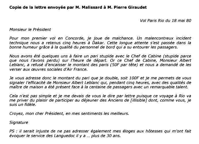 Sur un de mes derniers vols à destination de Rio, une panne à Dakar a duré près de cinq heures, j’ai dû accepter de parier avec des passagers sur l’heure de départ. C’était un pari osé, pris sur mon argent personnel (50 Francs par personne). Par chance, je l’ai gagné mais je n’ai pas accepté cet argent en demandant aux passagers parieurs de l’envoyer aux œuvres sociales d’Air France. L’un d’eux, M. Malissard, a doublé son pari ; je vous joins d’ailleurs copie de sa lettre, envoyée à M. Giraudet, à cette occasion :