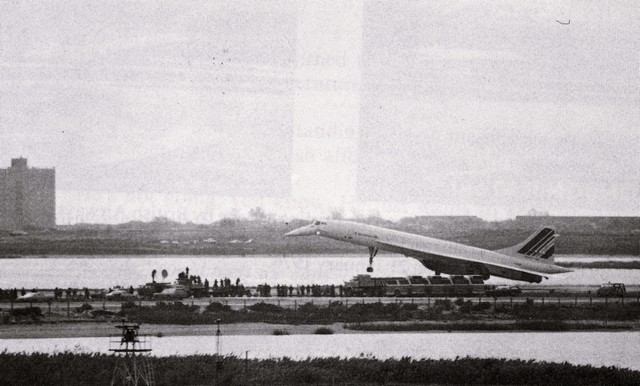 Je suis de retour au cockpit pour l’atterrissage. Afin d’enregistrer les conversations radio, je branche le câble « spécial » sur la prise « jack » du panneau technique et je mets en route le magnétophone que j’ai en bandoulière. Mon casque audio me fait entendre un son clair, une fois le volume ajusté. Bien calé au fond, entre les deux sièges des pilotes, sans trop gêner le mécanicien, je savoure l’ambiance de l’approche avec la réduction de vitesse et surtout le basculement du nez en position basse. La succession rapide des actions de l’équipage me fait supposer que nous sommes en finale et, en me penchant à l’extrême, je distingue la piste, encore loin devant. Nous reprenons contact avec le sol, suivis de près par le Concorde de British Airways.